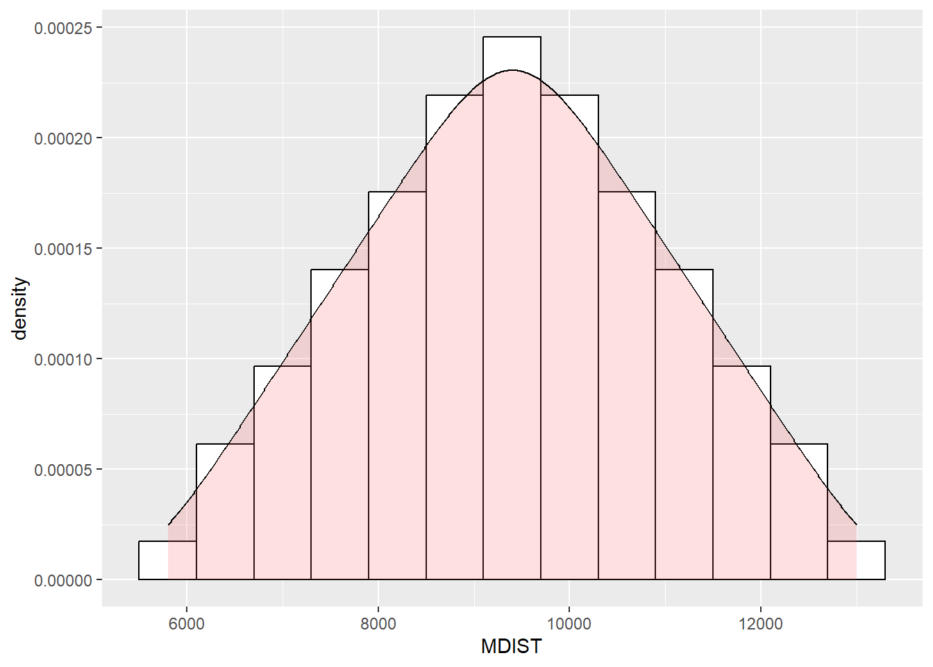 Even though the original population was a completely uniform distribution with a mean of 9400, the distribution of all of the sample means looks quite a lot like a normal distribution / bell curve!