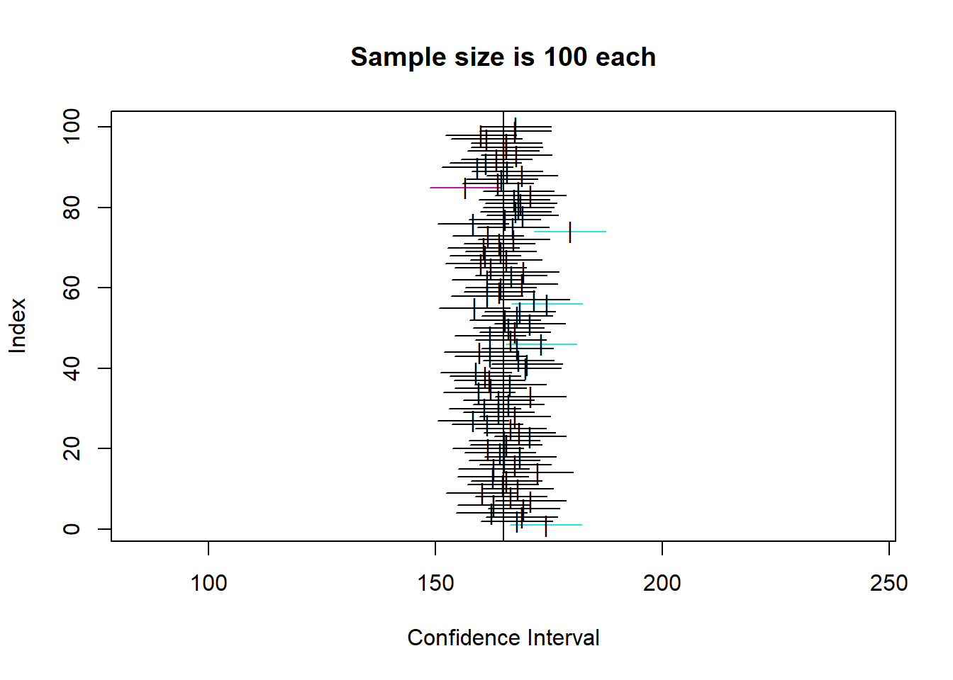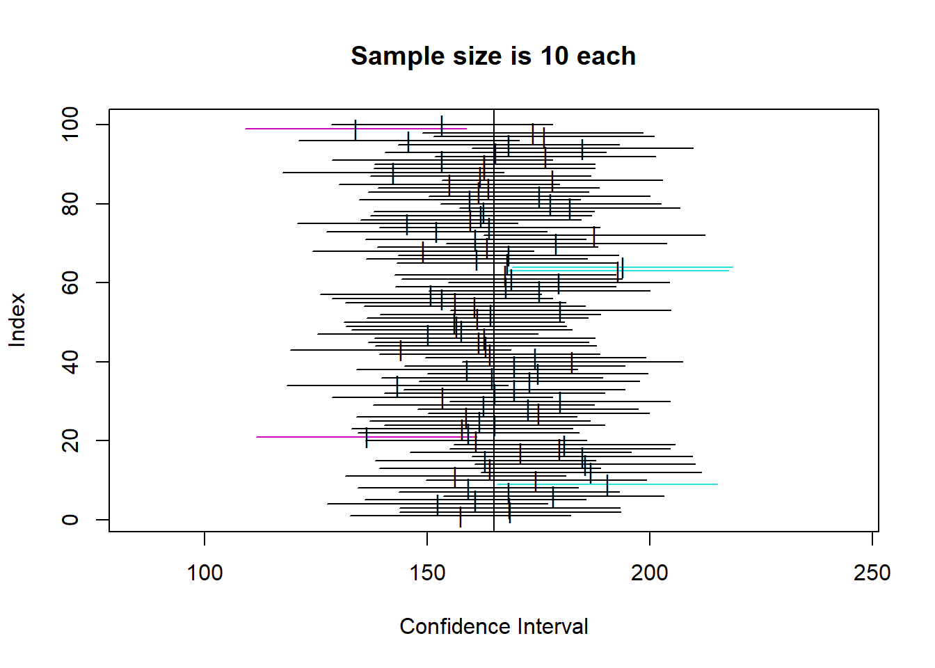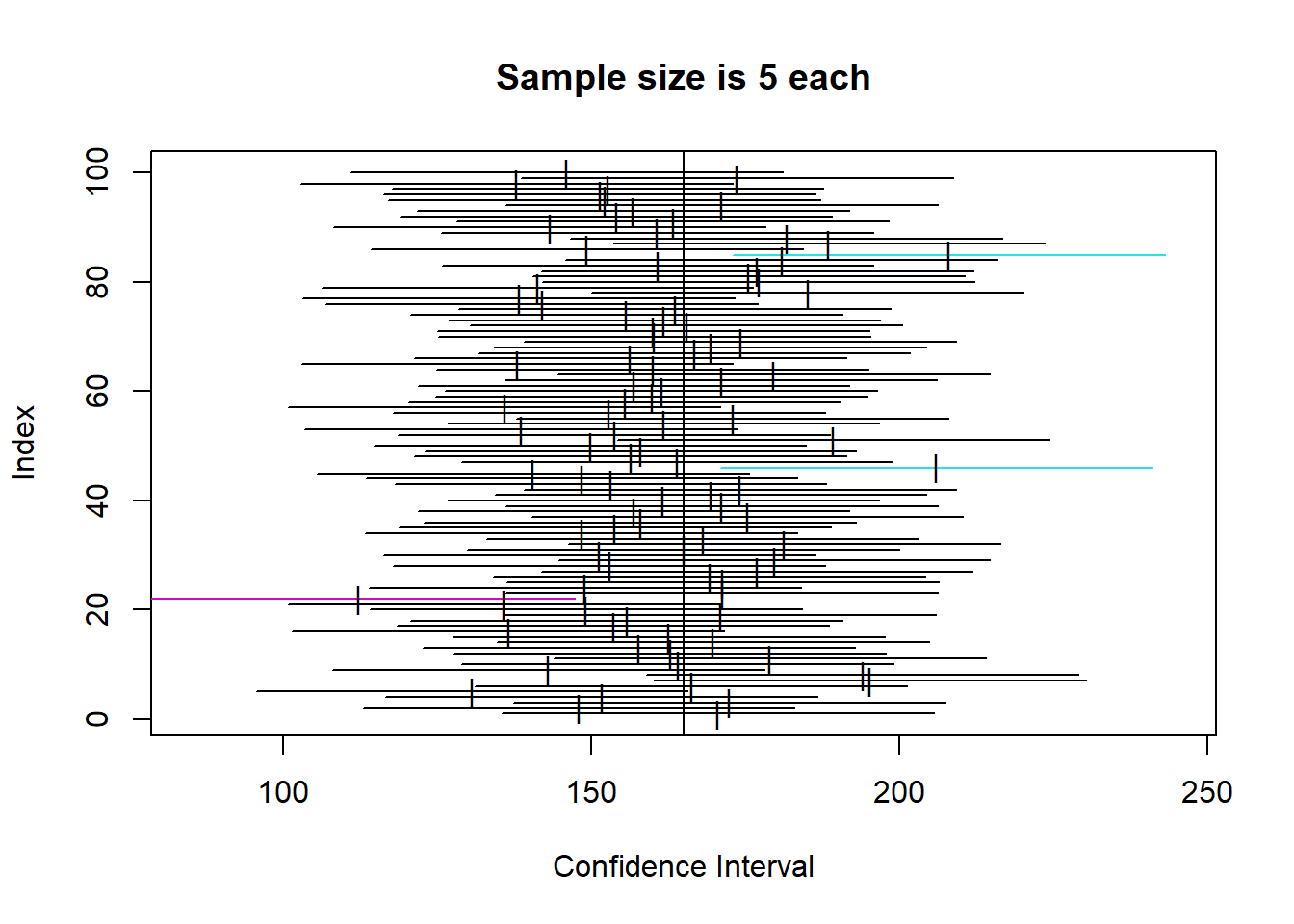 So, you can see that the confidence intervals for each of the 100 samples at a given sample size all cluster around the mean, but are wider as sample size is lower. That makes sense intuitively.