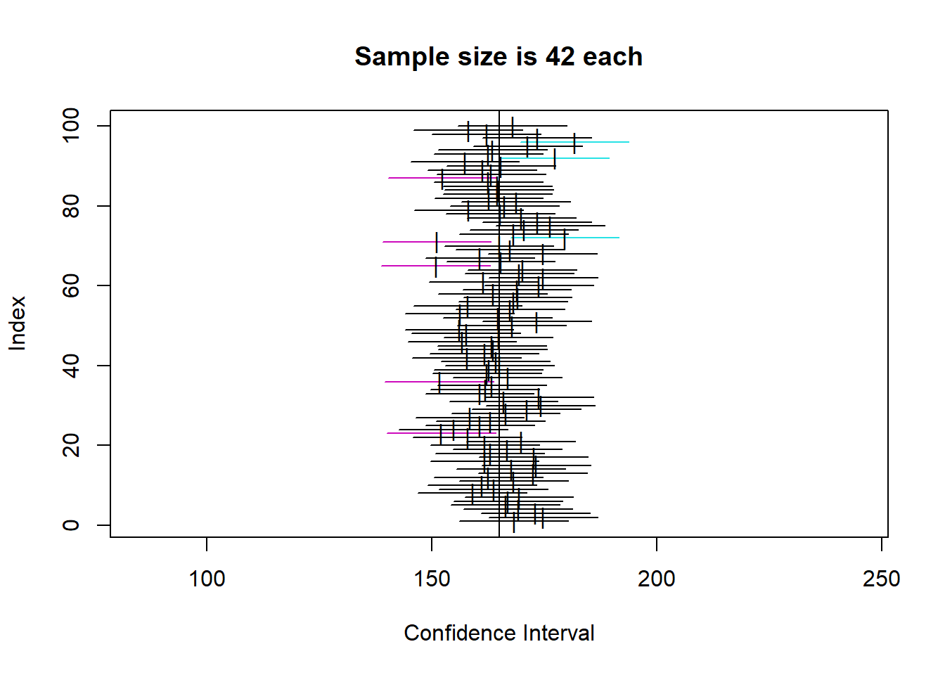 Looking specifically at our example N of 42, we can estimate which one of the 100 that might be, and see how the CI for sample means of about that size does include the real population mean of 165. You can also see there are a number of coloured CIs which do not include the sample mean. This shows how to interpret a CI.